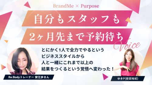 女性専門パーソナルトレーナー・Re:Bodyトレーナー安江歩さんが、なぜ、ゆきP(安田裕紀)を選び、わずか1年で「未来に燃える自分」へと激変したのか?ゆきPのプロデュースのエピソードとともに、パーパスを軸に迷いを断ち切り、次のステージへ踏み出した軌跡を語ってくれました。現状を打破したい女性起業家必見です。